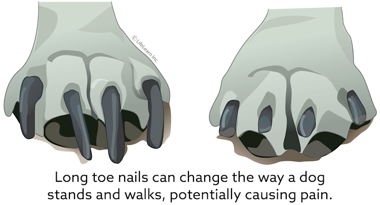 - Clip toenails as needed to prevent overgrowth. Long toenails may cause the dog to stand and walk abnormally and result in pain or accelerate and exacerbate arthritic changes.